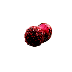 Mörk chokladpralin med vit chokladfyllning och svartvinbär. Rullad i torkad svartvinbär som ger kraftig smak (laktos).