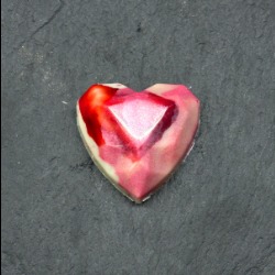 Krispig mjölkchokladpralin med hasselnötpraliné och små bitar av karamell. Kex doppad i hallonchoklad. (hasselnöt, laktos).