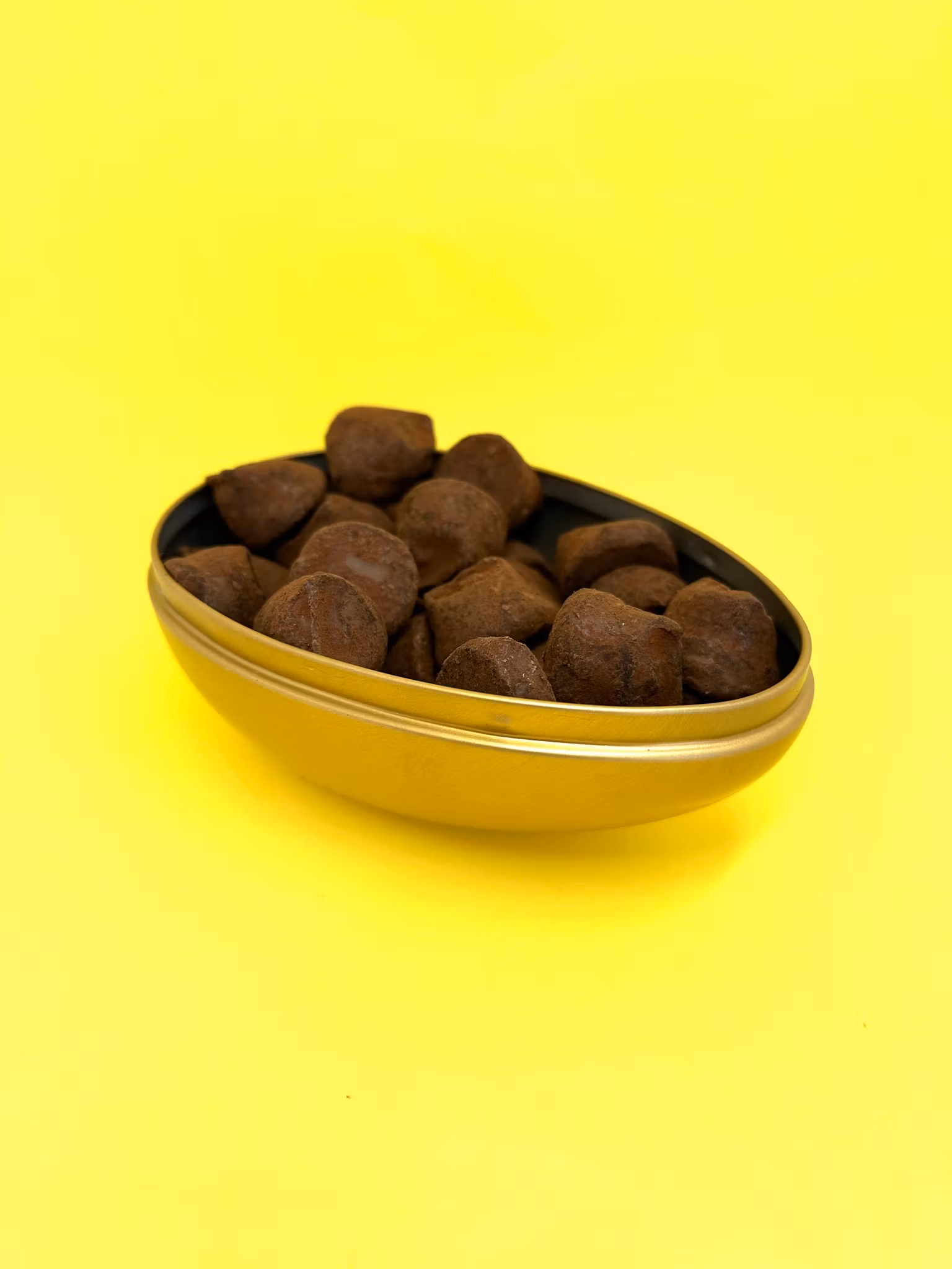 Traditionellt tillverkade med naturell smak, pudrade med fint kakaopulver. Förpackade i guldägg i metall.