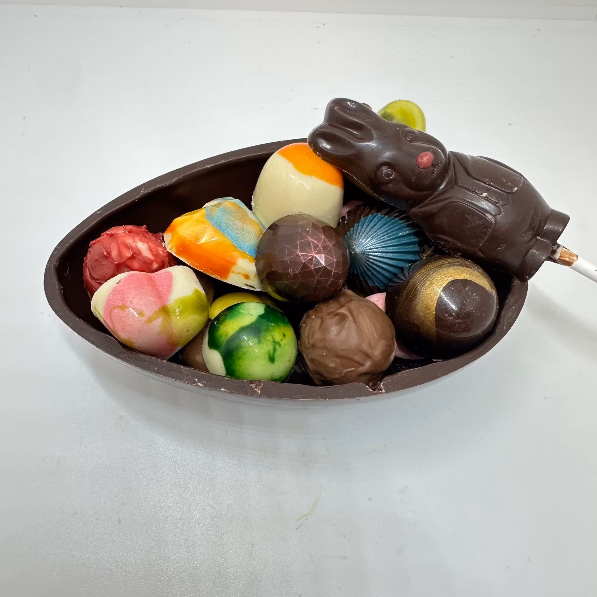 Chokladägg på fot, gjutet i mörk choklad med 12 praliner, mandlar, chokladkanin i cellofanförpackning.