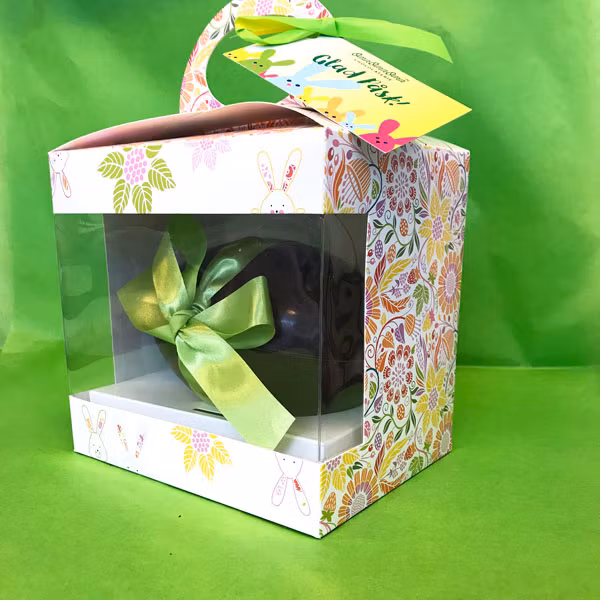 Gjutet helt chokladägg i mörk choklad med 22 praliner, 6 st franska tryfflar och 10 st chokladdragerade mandlar i mörk choklad och havssalt.