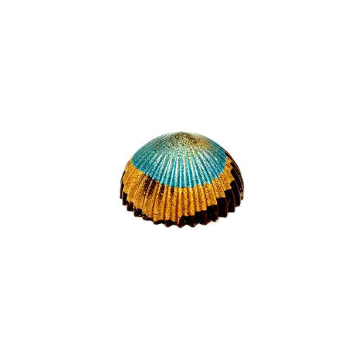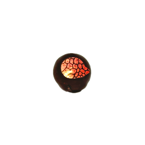 Mörk chokladpralin med havtorn. Handmålad i tre färger.
