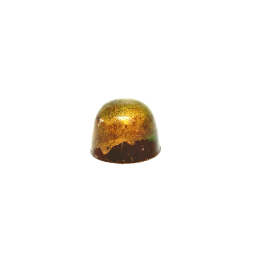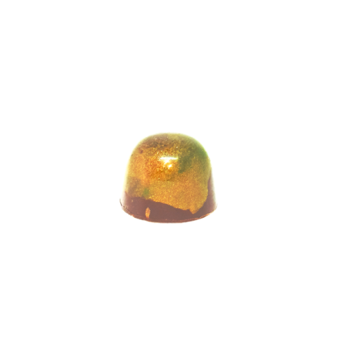 Två lager i en mörk chokladpralin. Äpple och Dulcey Blond, ni vet den tryffelkula som jag hade under lucka 15. Jag har målat med airbrush, först grön, sedan guld.