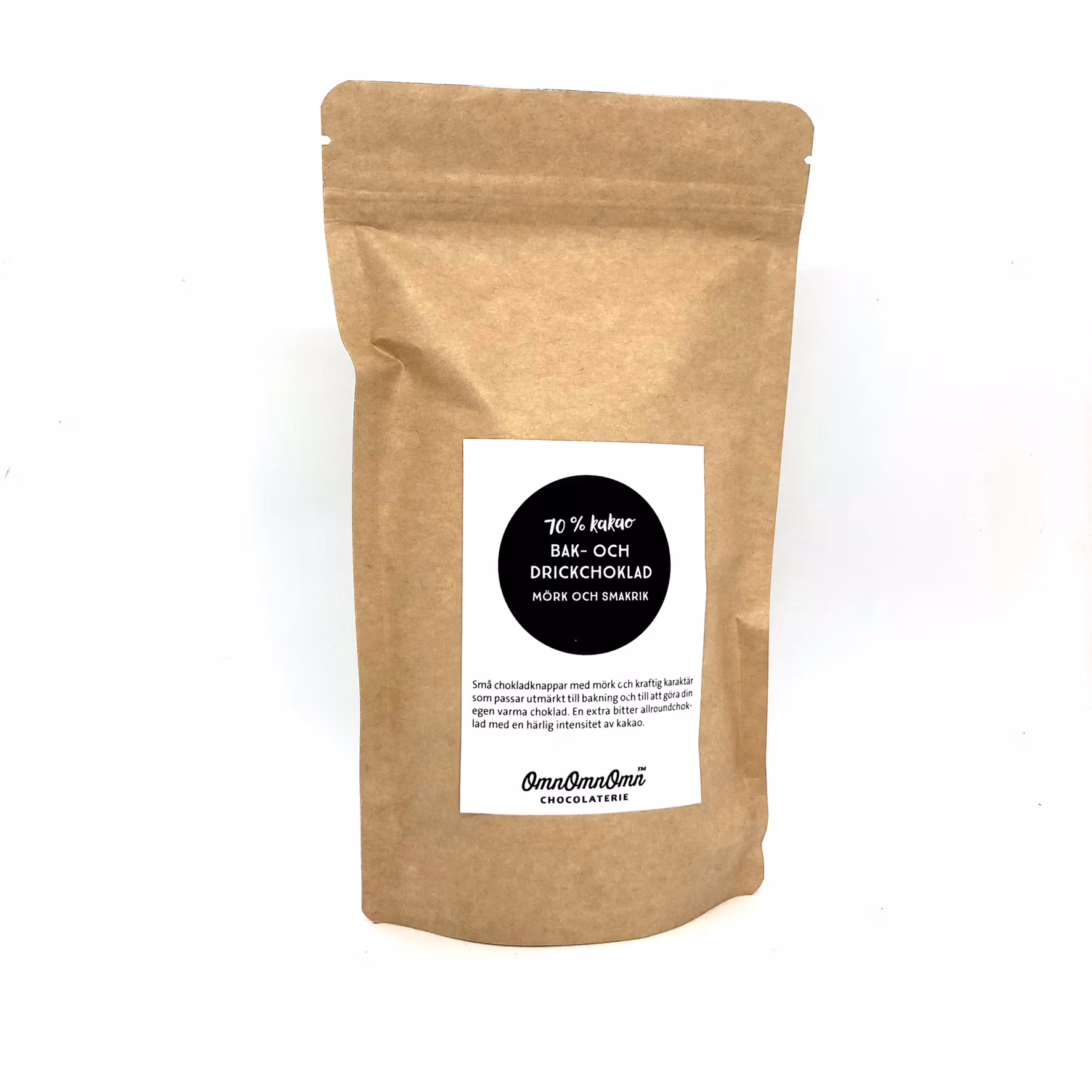 Små chokladknappar med 70 procent kakaohalt som passar utmärkt till bakning, att göra din egen varma choklad eller helt enkelt njuta av som de är.