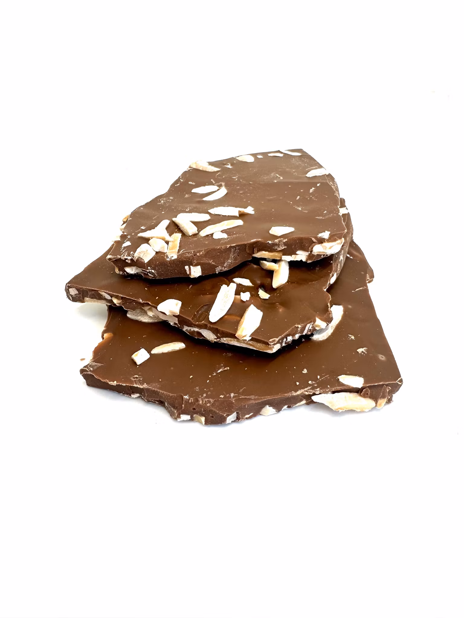 Bräck på mjölkchoklad, 36 procent kakaohalt och rostad, flisad mandel.