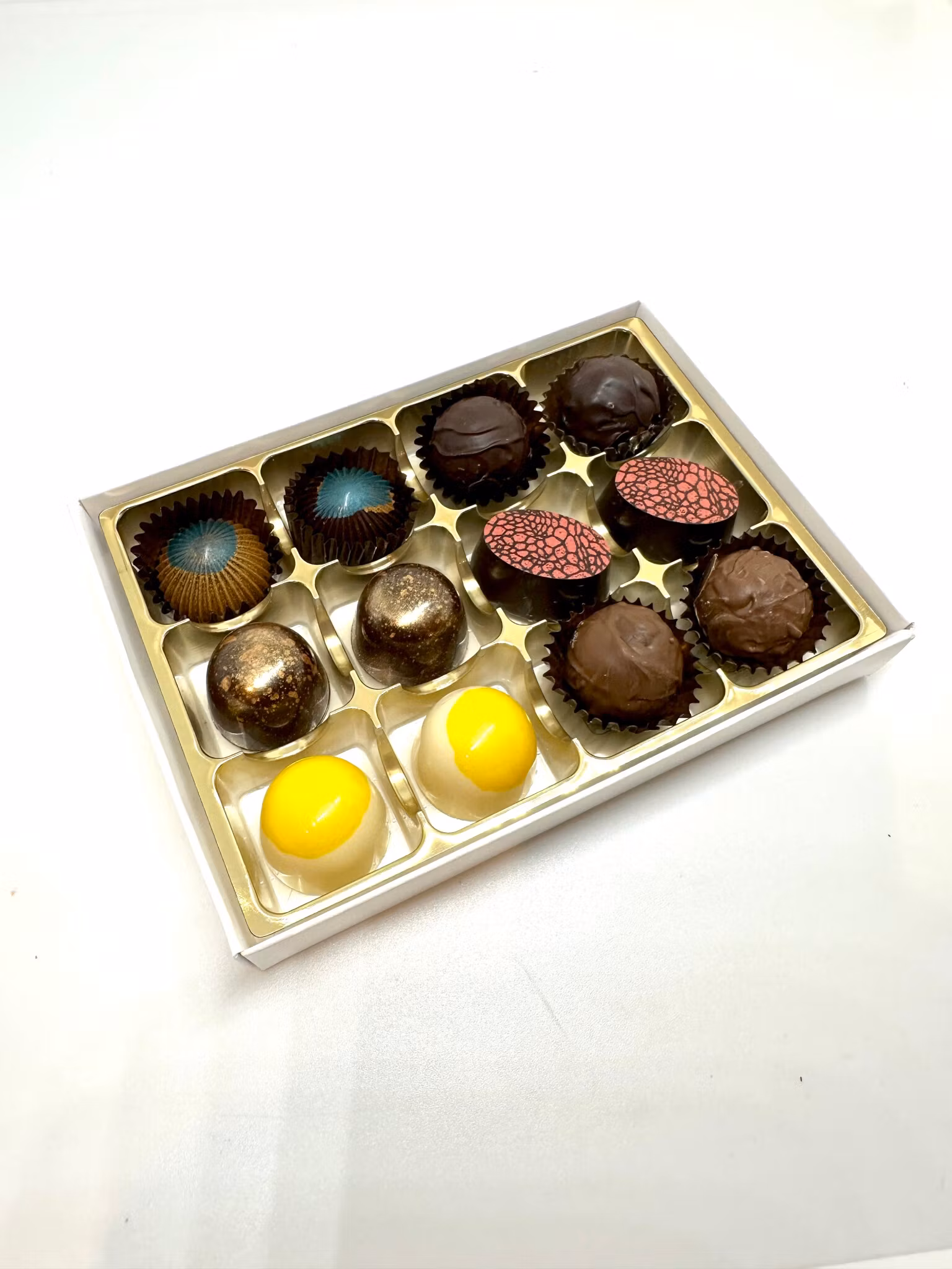 Chokladask med 12 st av vårt val av blandade handgjorda kvalitetspraliner. Fin gåva för både födelsedag och uppskattning.