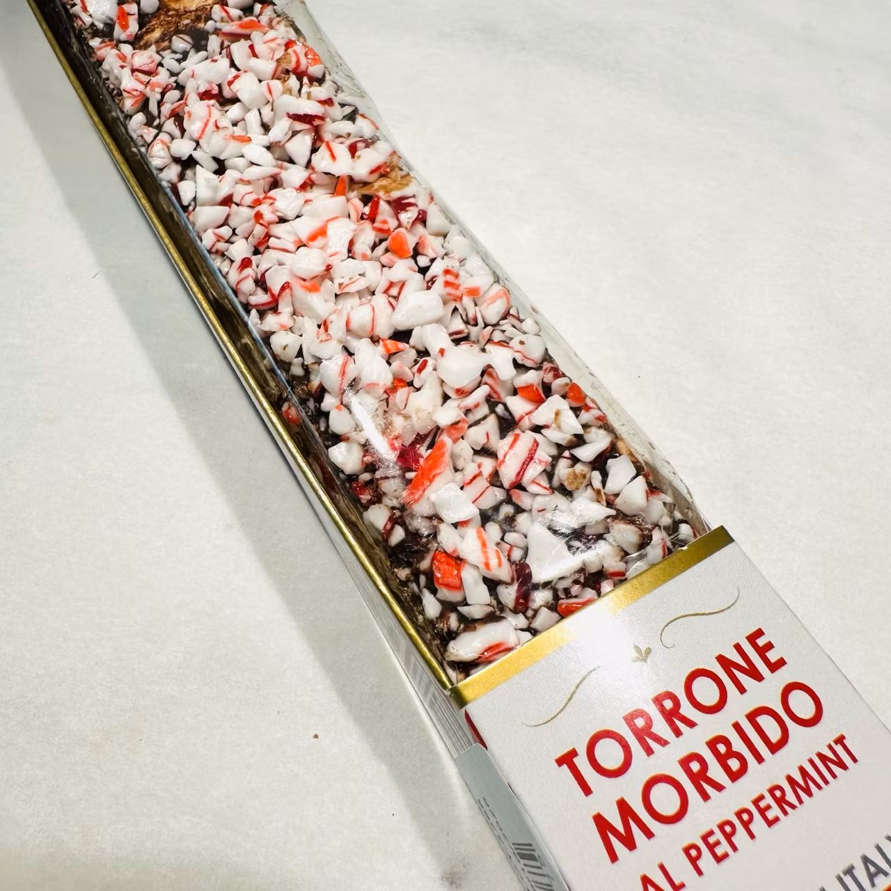 Mjuk vit toscansk torronenougat med pepparmintssmak (polka) och mandel. Vacker som gåva god som få.