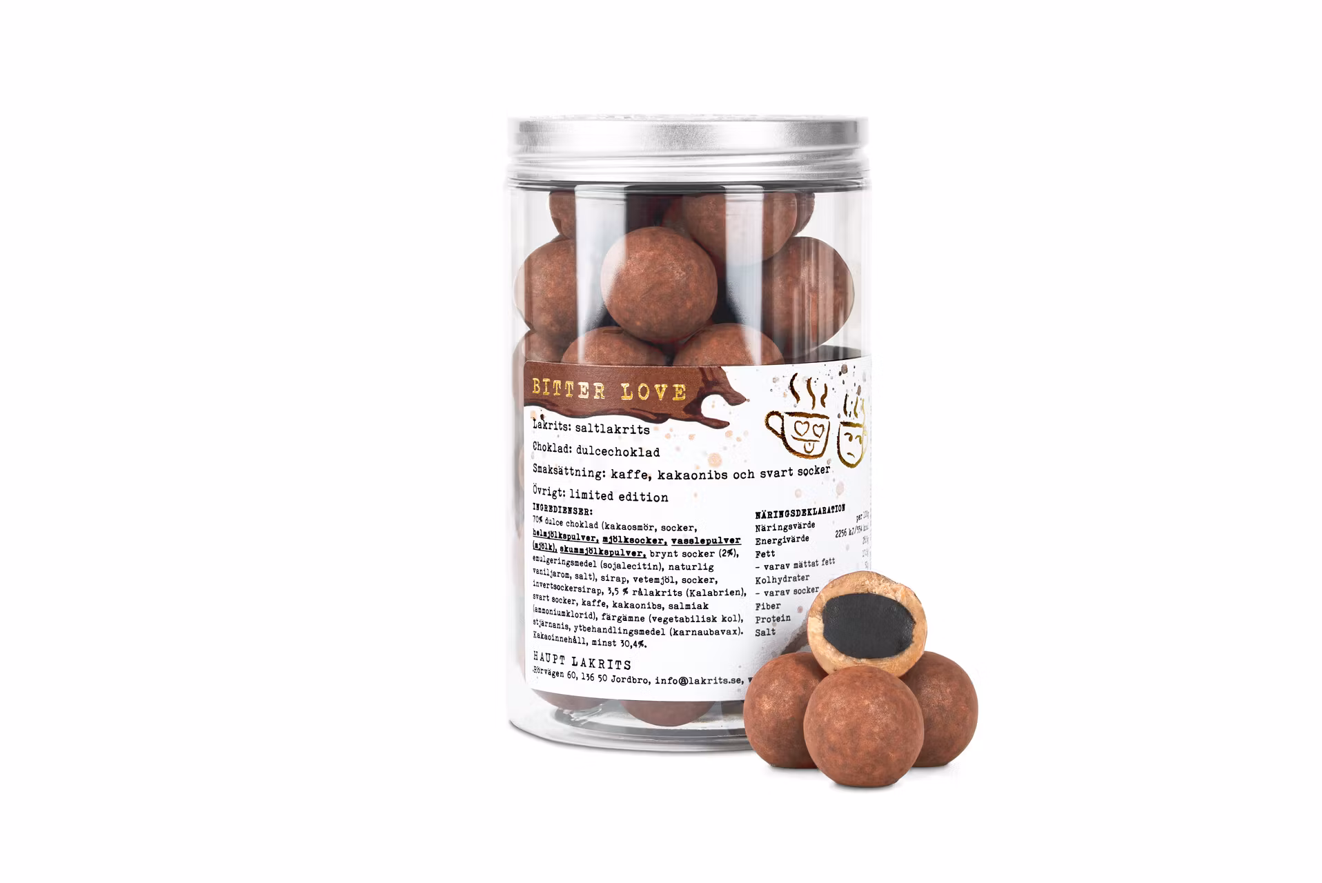 INGREDIENSER: 70% dulce choklad (kakaosmör, socker, helmjölkspulver, mjölksocker, vasslepulver (mjölk) , skummjölkspulver, brynt socker (2%), emulgeringsmedel (sojalecitin), naturlig vaniljarom, salt), sirap, vetemjöl, socker, invertsockersirap, 3,5 % rålakrits (Kalabrien), svart socker, kaffe, kakaonibs, salmiak (ammoniumklorid), färgämne (vegetabilisk kol), stjärnanis, ytbehandlingsmedel (karnaubavax). Kakaoinnehåll, minst 30,4%.