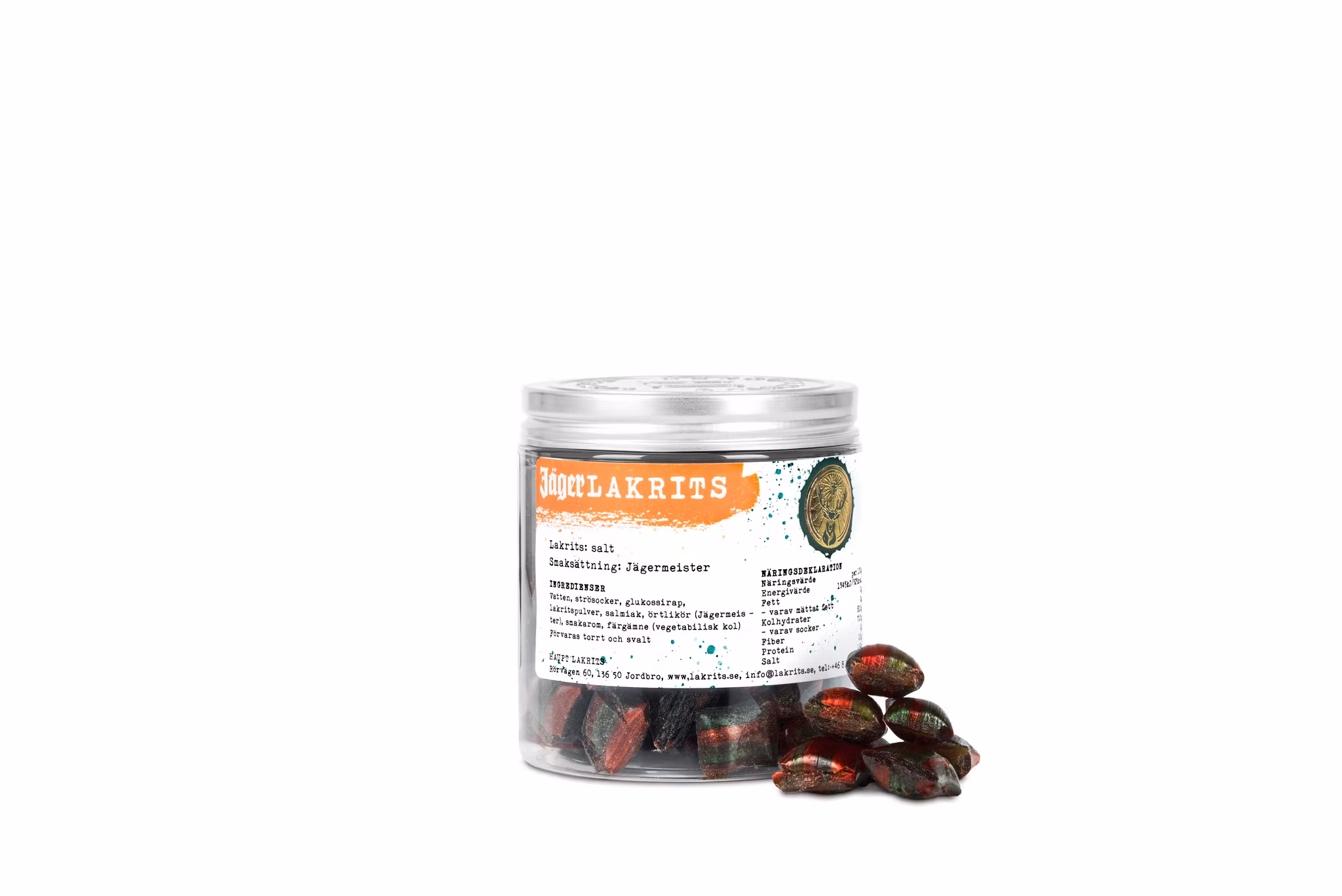 Ingredienser: Vatten, strösocker, glukossirap, lakritspulver, salmiak, örtlikör (Jägermeister), smakarom, färgämne (vegetabilisk kol)