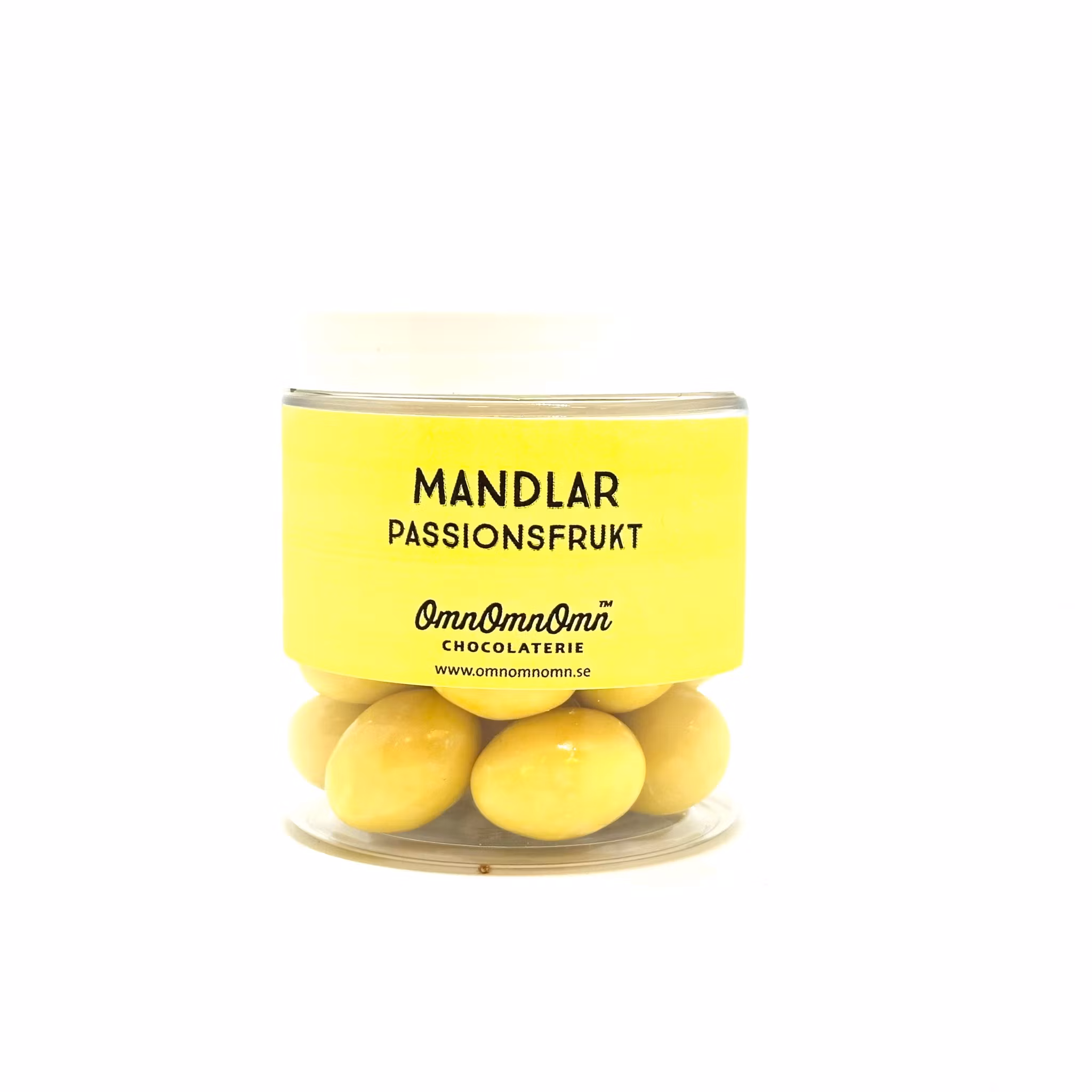 Mandlar dragerade med vit choklad med smak av passionsfrukt. Förpackade i burk.