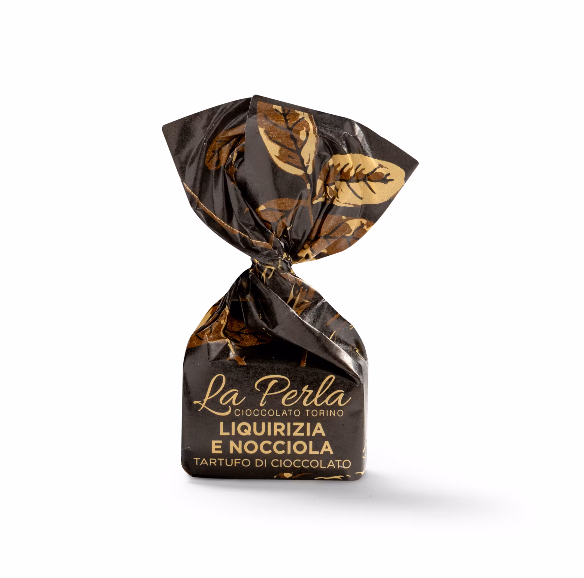 La Perlas lakritstryffel är en utsökt vit chokladtryffel med lakrits från Kalabrien, havssalt från Cervia och I.G.P ursprungsskyddade hasselnöt.